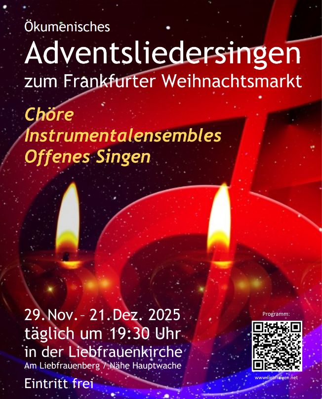 Wie in den vergangenen Jahren werden die Eli-Chöre wieder weltliche und geistliche Lieder in adventlicher Atmosphäre und wunderbarer Akustik in der Liebfrauenkirche singen (Nähe Hauptwache, umgeben vom Weihnachtsmarkt). Der Eintritt ist frei und wir freuen uns über ein großes Publikum!